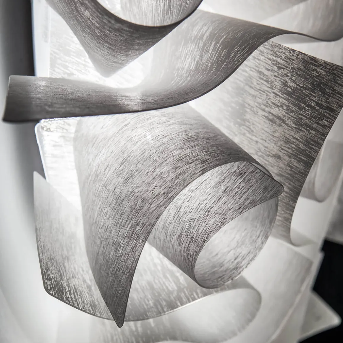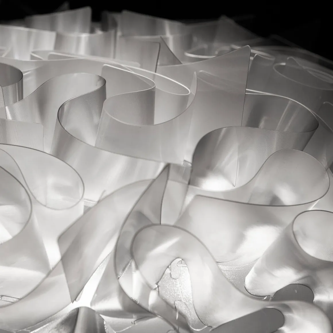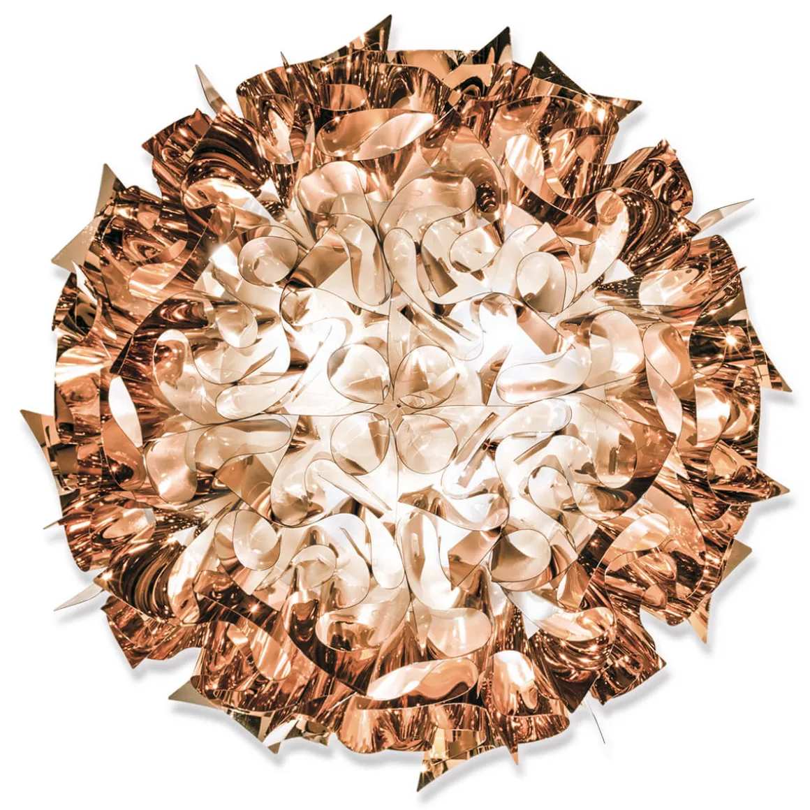 Besonders glamourös erscheint die Veli Ceiling / Wall Large von Slamp in den metallisierten Varianten aus Goldflex® und Copperflex®. Diese verleihen der Wand- und Deckenleuchte nicht nur eine luxuriöse, glanzvolle Note, sondern lassen auch vielfältige Spiegelungen entstehen. Die Couture-Version der Veli Large widerum betont mit ihrer von modernen Stoffstrukturen inspirierten Oberfläche die zeitgemäße und dekorative Ausstrahlung.