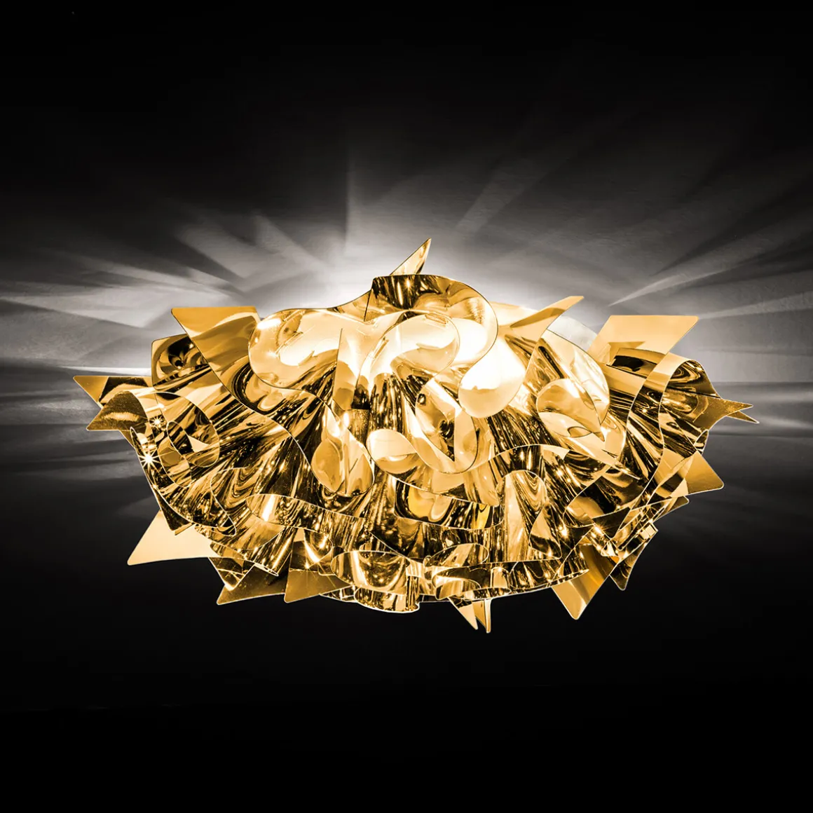 Der für die Slamp Veli verwendete Kunststoff ist widerstandsfähig und leicht zu reinigen. Opalisierendes Opalflex® erzeugt ein weiches Licht und eine zeitlos schöne Ästhetik, prismenhaft gestaltetes Lentiflex® überzieht die mit schillernden Lichtreflexen. Besonders glamourös wirkt die Slamp Veli Ceiling / Wall Medium in ihren Versionen aus metallisiertem Goldflex® und Copperflex®. Als exklusive Designobjekte gliedern sich die Wand- und Deckenleuchten privaten wie auch öffentlichen Räumlichkeiten ein.