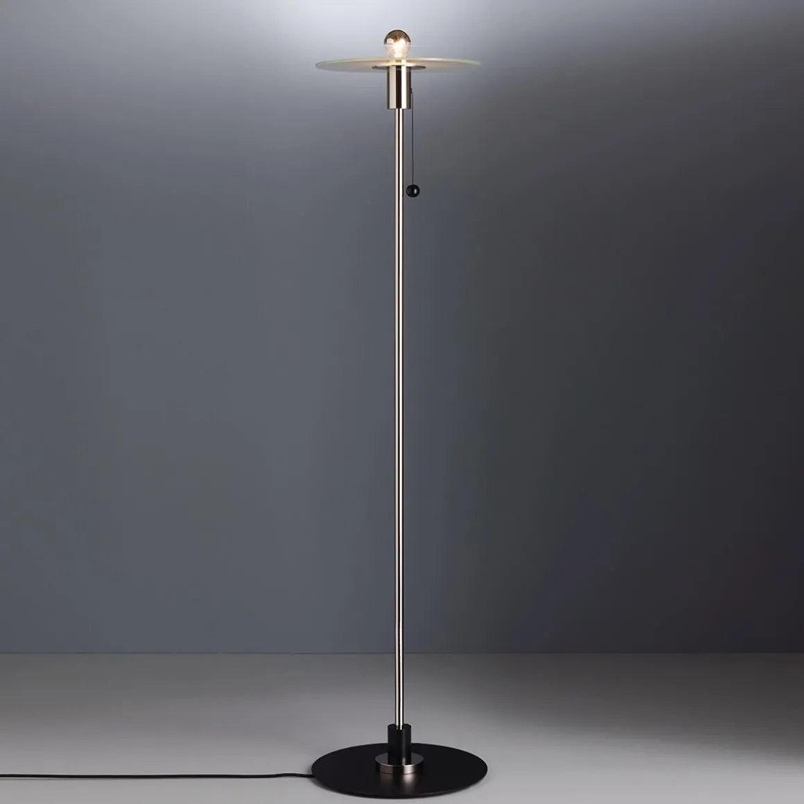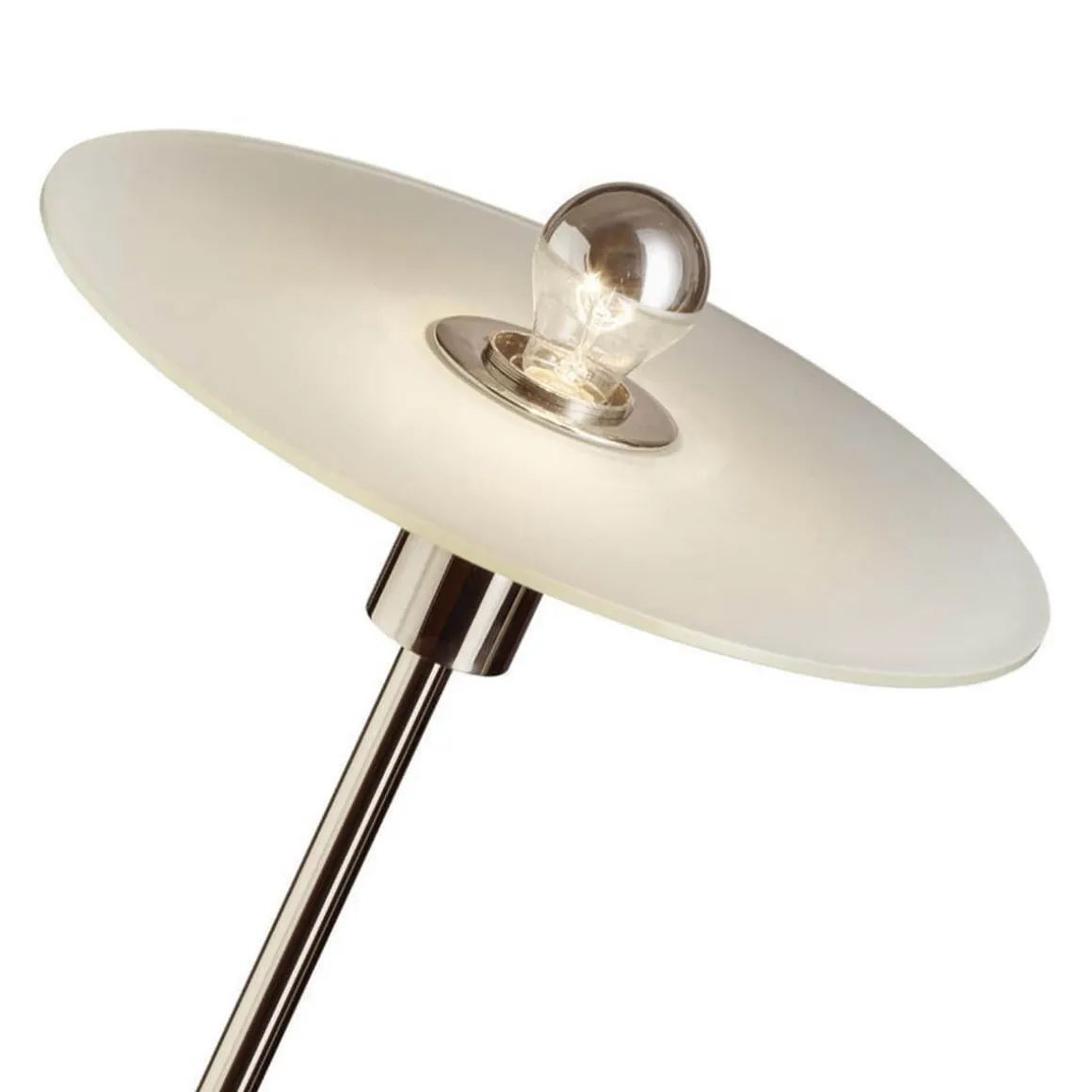 | Material/Oberfläche: | Messing vernickelt, Fuß: Eisen schwarz lackiert, Schirm: Glasscheibe ätzmatt |