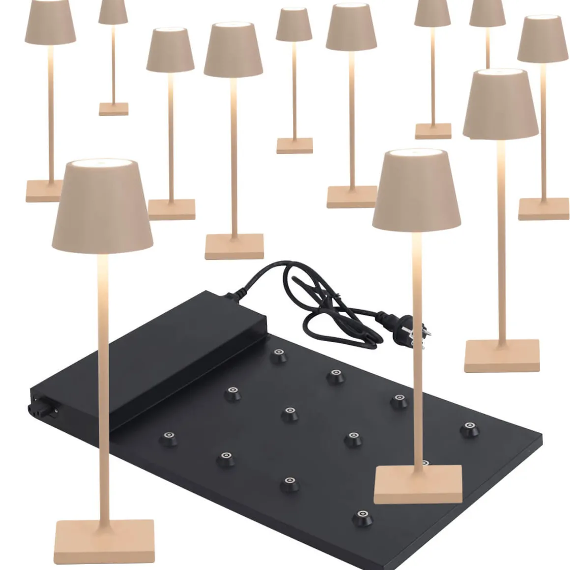 Sorgen Sie in Ihrem Unternehmen für ein stilvolles Ambiente mit dem Bündelangebot der Zafferano AiLati Poldina micro Pro LED Akkuleuchten. Das Set enthält zwölf kabellose Akkulampen, die dazugehörigen Einzel-Kontaktladestationen und eine Mehrfach-Ladestation, mit der alle Leuchten gleichzeitig wiederaufgeladen werden können.